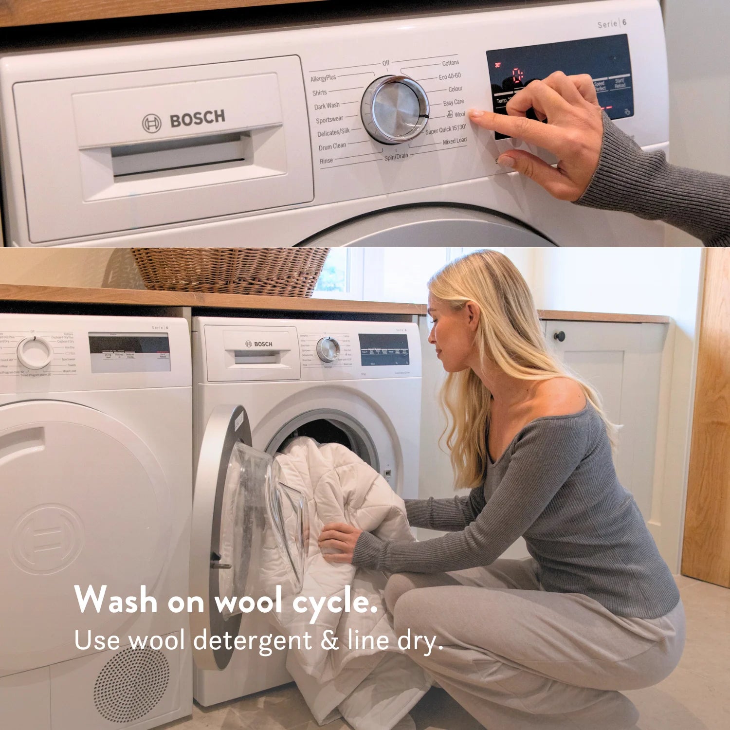 • Machine washable on a cool wool cycle with wool detergent - line dry